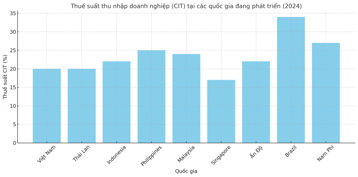 Mức CIT của Singapore ở mức thấp nhất (17%), kết hợp với hệ thống miễn giảm thuế hiệu quả và môi trường pháp lý minh bạch, khiến nước này trở thành điểm đến hấp dẫn hàng đầu trong khu vực. Brazil và Nam Phi vẫn duy trì mức CIT cao (lần lượt là 34% và 27%), phản ánh mô hình tài khóa cần nguồn thu lớn.