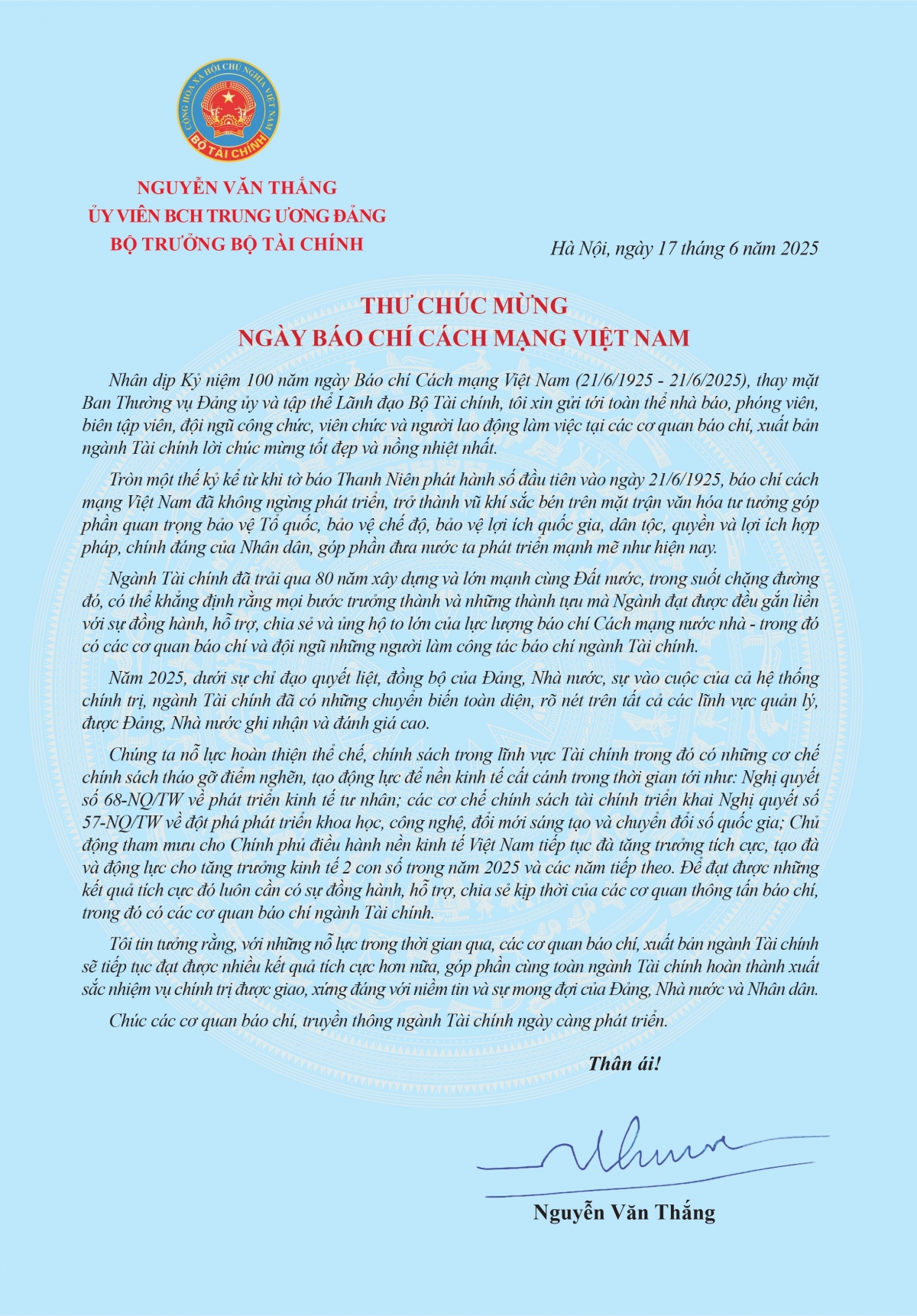 Nhân kỷ niệm 100 năm Ngày Báo chí Cách mạng Việt Nam (21/6/1925 - 21/6/2025), thay mặt Ban Thường vụ Đảng ủy, Lãnh đạo Bộ Tài chính, đồng chí Nguyễn Văn Thắng - Ủy viên Trung ương Đảng, Bộ trưởng Bộ Tài chính - gửi Thư chúc mừng các thế hệ cán bộ, phóng viên, biên tập viên, người lao động tại các cơ quan báo chí, tuyên truyền, xuất bản ngành Tài chính.