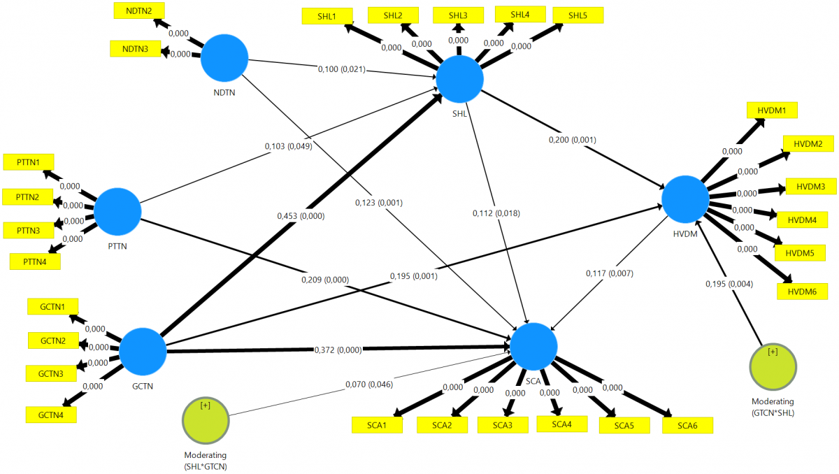 Kết quả phân tích PLS-SEM bằng phương pháp Bootstrap đều chấp nhận các giả thuyết đã đặt ra. Theo đó, nhận dạng tài năng, phát triển tài năng, giữ chân tài năng, sự hài lòng công việc, hành vi đổi mới đều tác động vào lợi thế cạnh tranh bền vững. Bên cạnh đó, nhận dạng tài năng, phát triển tài năng, giữ chân tài năng cũng có tác động vào sự hài lòng công việc của nhân viên và sự hài lòng công việc cũng có tác động vào hành vi đổi mới (Hình 2). Kết quả phân tích cũng khẳng định được tác động điều tiết của giữ chân tài năng. Tuy nhiên, giả thuyết H2, H4 bị bác bỏ. Do đó nghiên cứu tồn tại khoảng trống nghiên cứu.