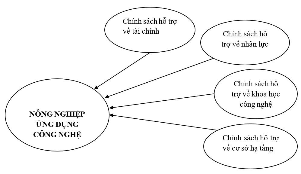 Dựa trên nghiên cứu tổng quan và mô hình lý thuyết đã được nghiên cứu trước đó, tác giả đã lựa chọn 4 chính sách có tác động nhiều nhất đến chính sách hỗ trợ nông nghiệp ứng dụng công nghệ cao trên địa bàn tỉnh Nam Định và phân tích các yếu tố (chính sách) tác động đến nông nghiệp ứng dụng công nghệ cao, lựa chọn và xây dựng mô hình tương quan tổng thể có dạng: