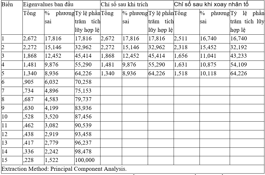Bảng 2 cho thấy: Hệ số KMO có giá trị = 0,613, thỏa mãn điều kiện: 0,5 ≤ KMO ≤ 1, nên phân tích nhân tố phù hợp với dữ liệu thực tế