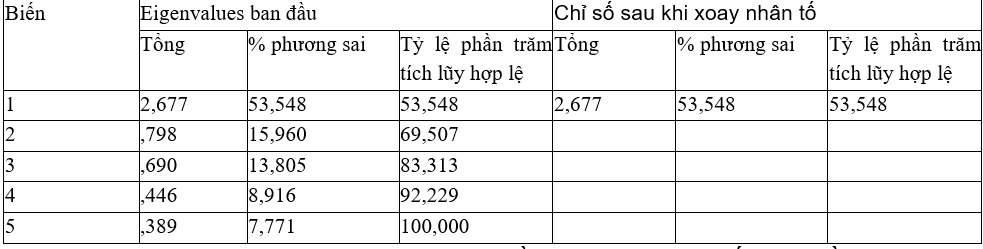 Bảng 4 cho thấy, tổng phương sai trích có giá trị 53,548 % >50% đáp ứng tiêu chuẩn. Như vậy, 53,548% thay đổi của nhân tố được giải thích bới các biến quan sát phụ thuộc.