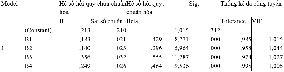 Giá trị kiểm định của 4 biến độc lập có mức ý nghĩa Sig. < 0,05, nên các biến độc lập có ý nghĩa thống kê. Các giá trị VIF < 10, nên không có hiện tượng đa cộng tuyến trong mô hình.