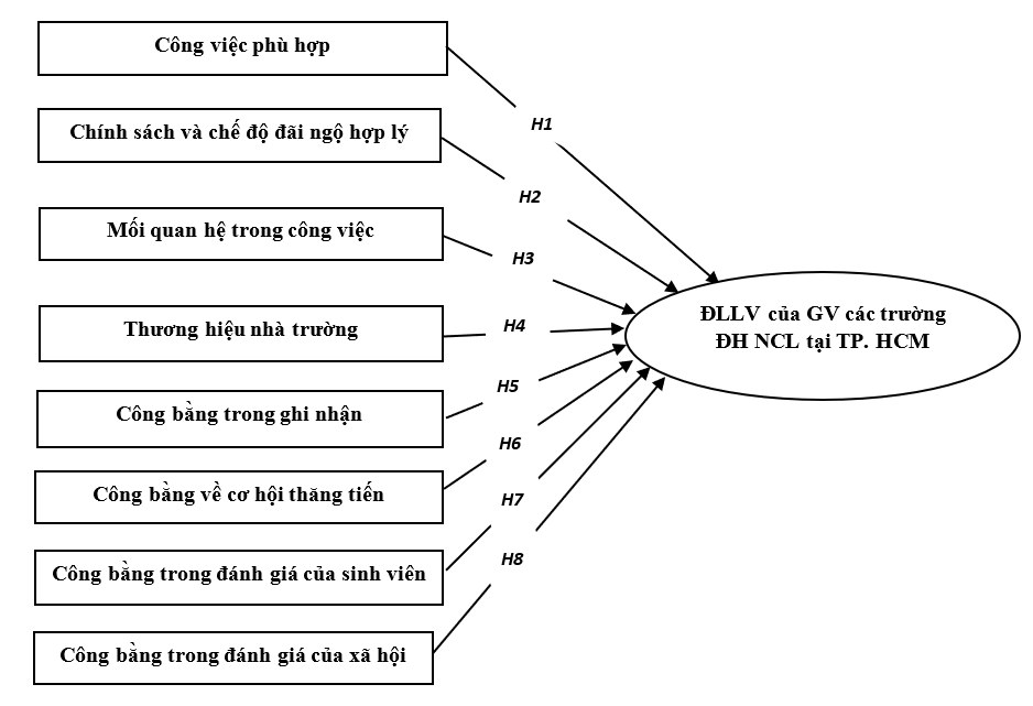 Từ cơ sở lý thuyết và các lý thuyết nền tảng liên quan, tác giả xây dựng mô hình nghiên cứu các yếu tố ảnh hưởng đến ĐLLV của giảng viên các trường đại học NCL trên địa bàn TP. Hồ Chí Minh như Hình.
