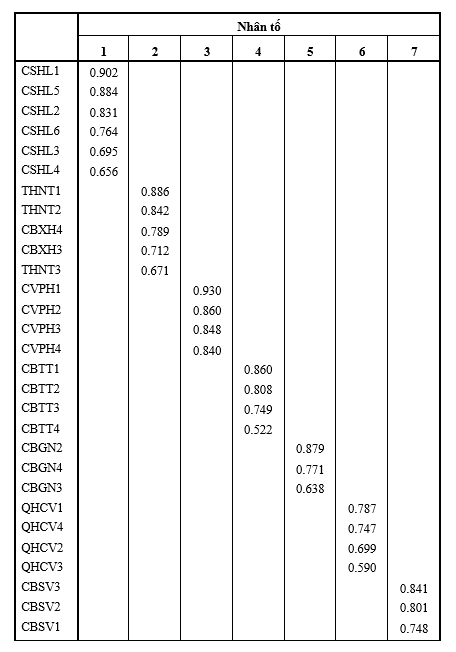 Sau khi thực hiện kiểm định độ tin cậy của các thang đo với hệ số Cronbach’s Alpha và phân tích EFA nhằm đánh giá giá trị của thang đo, kết quả của Bảng 1 cho thấy, các biến quan sát của các biến độc lập được rút trích còn 7 nhân tố. Trong đó, 6 nhân tố vẫn giữ nguyên ý nghĩa và số lượng các biến quan sát đo lường là: CSHL (Chính sách và chế độ đãi ngộ hợp lý), CVPH (Công việc phù hợp), CBTT (Công bằng về cơ hội thăng tiến), CBGN (Công bằng trong ghi nhận), QHCV (Mối quan hệ trong công việc) và CBSV (Công bằng trong đánh giá của sinh viên). Riêng nhân tố còn lại là sự kết hợp giữa 2 thành phần CBXH và THNT, được tác giả đặt tên lại là Thương hiệu và xã hội (THXH).