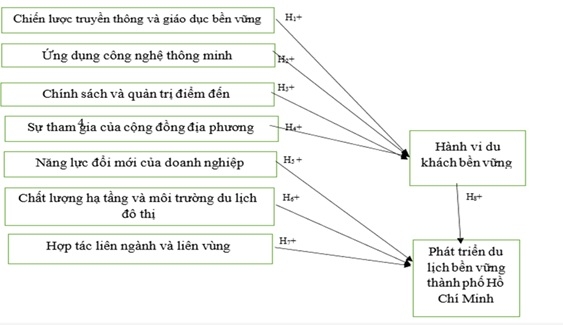 Trong nghiên cứu này, nhóm tác giả vận dụng mô hình của Trương Trí Thông (2020) nhằm phân tích các yếu tố ảnh hưởng đến phát triển du lịch bền vững tại TP. Hồ Chí Minh. Mô hình xác định 8 nhóm nhân tố chính với tổng cộng 33 biến quan sát, gồm: (1) Chính sách và quản trị điểm đến (4 biến), (2) Năng lực đổi mới doanh nghiệp (4 biến), (3) Ứng dụng công nghệ thông minh (5 biến), (4) Sự tham gia cộng đồng (4 biến), (5) Hạ tầng và môi trường du lịch đô thị (4 biến), (6) Truyền thông – giáo dục bền vững (4 biến), (7) Hợp tác liên ngành – liên vùng (3 biến), (8) Hành vi du khách bền vững (5 biến), cùng với biến phụ thuộc là (9). Phát triển du lịch bền vững (3 biến). Mô hình này được kỳ vọng phản ánh toàn diện các khía cạnh ảnh hưởng, phù hợp với bối cảnh đặc thù của đô thị lớn như TP. Hồ Chí Minh.