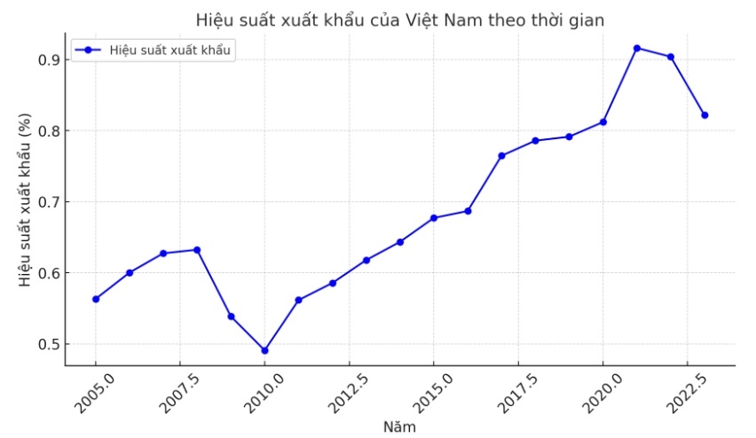 Giai đoạn 2005-2008: hiệu suất xuất khẩu tăng từ 0,56% lên khoảng 0,63. Đây là thời kỳ Việt Nam gia nhập WTO, mở ra nhiều cơ hội cho thương mại quốc tế. Sự gia tăng này không chỉ đến từ lượng hàng hóa xuất khẩu mà còn từ việc Việt Nam nâng cao chất lượng sản phẩm, đáp ứng tiêu chuẩn quốc tế, từ đó thu hút được nhiều đối tác thương mại.