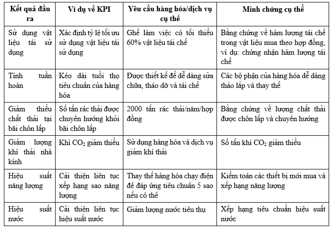 Các yêu cầu bền vững về môi trường cần được trình bày trong Báo cáo nghiên cứu thị trường và yêu cầu mời thầu phải được thiết kế một cách rõ ràng, có thể xác minh và cho phép cạnh tranh công bằng, trong đó các yêu cầu tập trung vào đặc điểm của hàng hóa, hiệu suất và yêu cầu chức năng, yêu cầu tuần hoàn, cam kết với môi trường. Đồng thời, cần tích hợp các kết quả đầu ra về môi trường, khí hậu và tuần hoàn vào yêu cầu mời thầu.