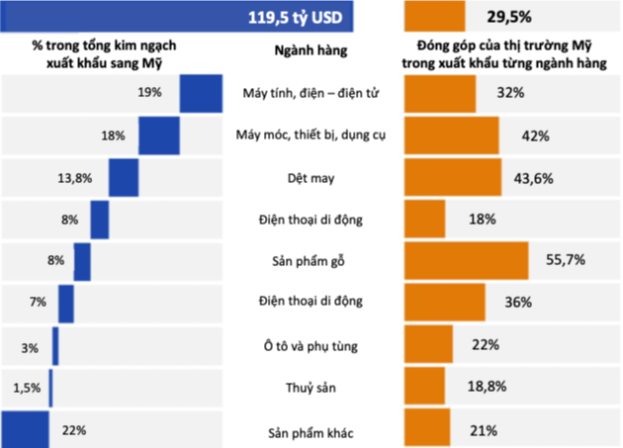 Đối với các sản phẩm gỗ, Mỹ là thị trường chiếm tới 55,7% tổng kim ngạch xuất khẩu gỗ năm 2024, với 9,06 tỷ USD và gần bằng 8% tổng kim ngạch xuất khẩu sang thị trường Mỹ của Việt Nam. Các mặt hàng chính Việt Nam xuất khẩu sang Mỹ là đồ gỗ nội ngoại thất (89,9%), có giá trị gia tăng cao hơn nhiều so với sản phẩm Việt Nam xuất khẩu sang các thị trường lớn khác như Nhật bản (dăm gỗ, viên nén gỗ), Hàn Quốc (viên nén gỗ), Trung Quốc (dăm gỗ). Tuy nhiên, trước đây sản phẩm gỗ của Việt Nam xuất khẩu sang Mỹ được hưởng mức thuế 0%, tạo ra lợi thế cạnh tranh về giá và Việt Nam áp thuế cho sản phẩm nội thất nhập khẩu từ Mỹ là 25%, thì nay, nếu bị áp thuế đối ứng 20%, chi phí sản xuất và xuất khẩu sản phẩm gỗ của Việt Nam sẽ tăng thêm khoảng 1,8 tỷ USD mỗi năm, khiến giá sản phẩm gỗ tăng mạnh và giảm lợi thế cạnh tranh.