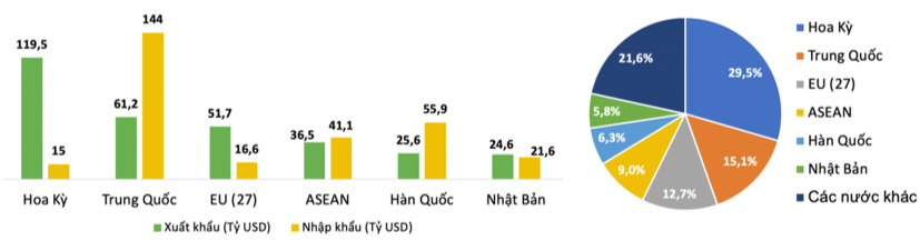 Hình 3: Kim ngạch xuất nhập khẩu (trái) và tỷ trọng các thị trường xuất khẩu chính (phải) của Việt Nam năm 2024