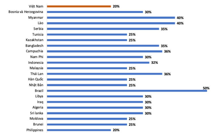 Hình 2: Tương quan mức thuế đối ứng của Việt Nam và 22 quốc gia đã được công bố tính đến ngày 9/7/2025
