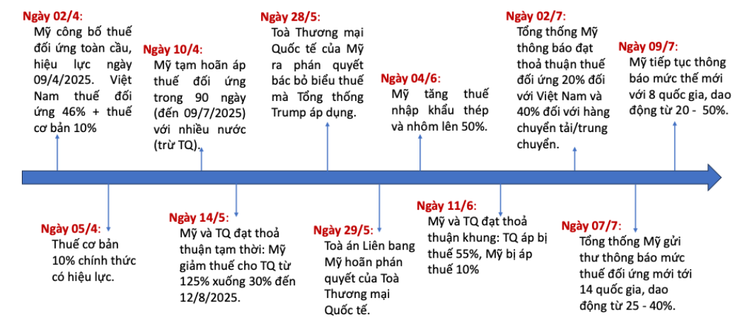 Ngày 9/4/2025, chính sách thuế đối ứng của Mỹ chính thức có hiệu lực, trong đó áp mức thuế lên đến 46% đối với hàng hoá nhập khẩu từ Việt Nam. Tuy nhiên, ngày 10/4/2025, Tổng thống Mỹ tuyên bố hoãn chính sách này và mở ra giai đoạn đàm phán kéo dài 90 ngày (đến ngày 9/7/2025). Trong thời gian chờ đàm phán, Việt Nam cùng 55 quốc gia khác (trừ Trung Quốc) vẫn chịu mức thuế đối ứng 10%. Ngày 7/7/2025, Tổng thống Mỹ gửi thông báo mức thuế đối ứng mới, dao động từ 25%-40% tới 14 quốc gia. Ngày 9/7/2025, Mỹ tiếp tục công bố thêm mức thuế đối ứng mới với 8 quốc gia, trong đó cao nhất là mức thuế suất 50% (Hình 1).