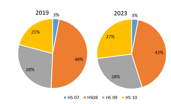 Như vậy, XK nông sản Việt Nam trong giai đoạn 2019-2023 có sự tăng trưởng ấn tượng. Nhóm quả và hạt (HS 08) và ngũ cốc (HS 10) là hai động lực chính thúc đẩy tăng trưởng mạnh mẽ trong năm 2023. Trong khi đó, cà phê, chè (HS 09) duy trì mức tăng trưởng ổn định, còn rau và một số loại thân củ (HS 07) có mức tăng chậm nhưng bền vững.