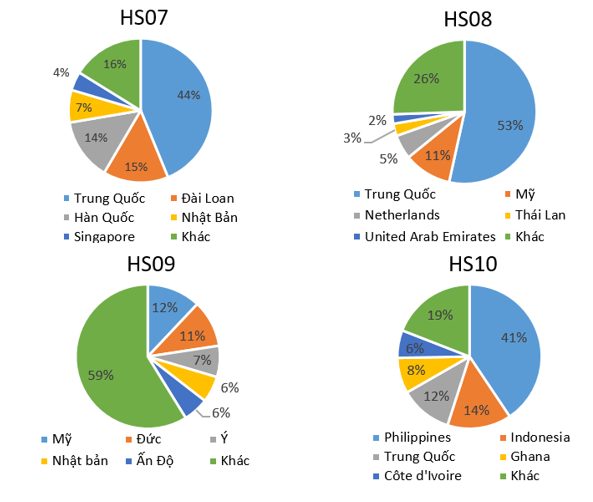 - Nhóm cà phê, chè (HS 09): Mỹ vẫn là thị trường lớn nhất với 59%, tiếp đến là Nhật Bản (12%), Đức, Ấn Độ và Ý chiếm tỷ lệ nhỏ hơn. Điều này cho thấy cà phê, chè Việt Nam có sức hút mạnh mẽ tại Mỹ, trong khi châu Âu và châu Á cũng là các thị trường tiềm năng nhưng chưa chiếm tỷ trọng lớn.