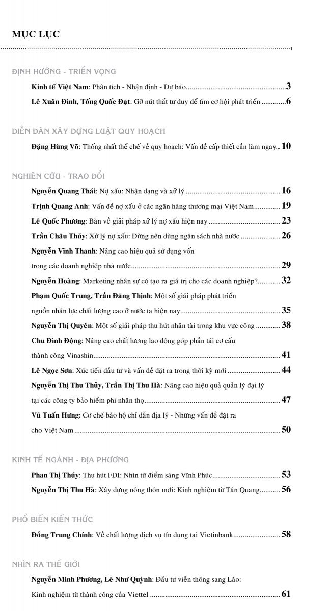 Nợ xấu đang là chủ đề của nóng của nền kinh tế. Vậy, hiện nay nợ xấu của nước ta đang ở trong giai đoạn nào? Giải quyết vấn đề nợ xấu như thế nào?...Tất cả những câu hỏi này sẽ được phản ánh trong chuyên mục Nghiên cứu – Trao đổi trong số tạp chí kỳ này. Cũng trong chuyên mục này, Tạp chí gửi đến bạn đọc nhiều bài viết với những nội dung, góc nhìn khác nhau về các vấn đề khác của nền kinh tế, với các bài viết của các tác giả: Nâng cao hiệu quả sử dụng vốn trong các doanh nghiệp nhà nước của tác giả Nguyễn Vĩnh Thanh; Marketing nhân sự có tạo ra giá trị cho các doanh nghiệp của tác giả Nguyễn Hoàng; Một số giải pháp phát triển nguồn nhân lực chất lượng cao ở nước ta hiện nay của hai tác giả Phạm Quốc Trung và Trần Đăng Thịnh; Một số giải pháp thu hút nhân tài trong khu vực công của tác giả Nguyễn Thị Quyên; Nâng cao chất lượng lao động góp phần tái cơ cấu thành công Vinashin của tác giả Chu Đình Động; Xúc tiến đầu tư và vấn đề đặt ra trong thời kỳ đổi mới của tác giả Lê Ngọc Sơn; Nâng cao hiệu quả quản lý đại lý tại các công ty bảo hiểm phi nhân thọ của tác giả Nguyễn Thị Thủy và Trần Thị Thu Hà; Cơ chế bảo hộ chỉ dẫn đại lý-Những vấn đề đặt ra cho Việt Nam của tác giả Vũ Tuấn Hưng.