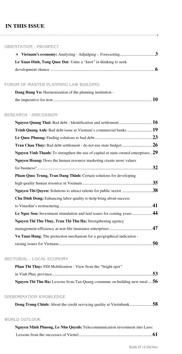 Một số những phân tích dự báo về tình hình kinh tế Việt Nam trong thời gian tới sẽ được phán ánh thông qua bài viết Kinh tế Việt Nam – Phân tích- Nhận định – Dự báo sẽ mở đầu cho chuyên mục Định hướng – Triển vọng trong số ra Tạp chí kỳ này. Tiếp đến là bài viết Gỡ nút thắt tư duy để tìm cơ hội phát triển của hai tác giả Lê Xuân Đình và Tống Quốc Đạt, bài viết nêu ra 5 vấn đề lớn và cấp thiết trong công cuộc đổi mới của đất nước trong giai đoạn hiện nay.