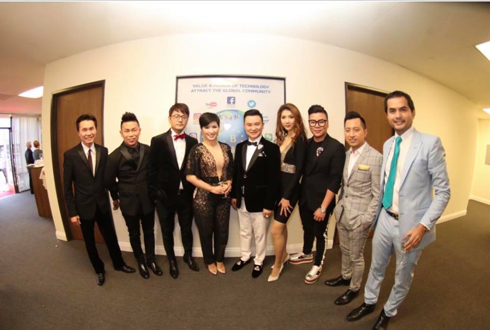Từ trái qua DV Trương Minh Cường, ca sĩ Nguyễn Hồng Nhung, luật sư David J.Myer, Chủ tịch Global Topstars Diệp Khắc Cường, ca sĩ Huy Vũ, danh hài Hoài Tâm cùng cắt băng khánh thành .