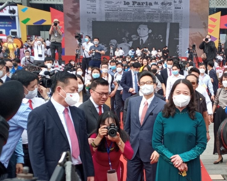| Từ phải qua trái: Phó Chủ tịch nước Nguyễn Thị Ánh Xuân, Phó Thủ tướng Chính phủ Vũ Đức Đam, Chủ tịch Hội Nhà báo Việt Nam Lê Quốc Minh, Trưởng Ban Tuyên giáo Trung ương Nguyễn Trọng Nghĩa thăm các gian trưng bày tại Hội Báo toàn quốc 2022 |