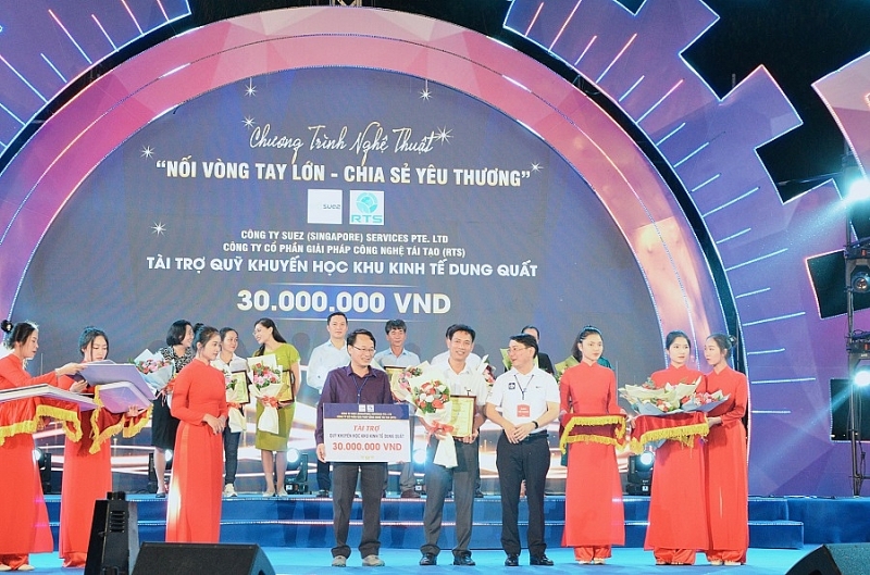 Cũng tại Chương trình ca nhạc, Ban tổ chức và lãnh đạo tỉnh Quảng Ngãi đã trực tiếp trao quà cho các cháu học sinh là con em của công nhân có hoàn cảnh khó khăn trên địa bàn KKT Dung Quất và các KCN Quảng Ngãi đã vượt khó vươn lên học giỏi, tiếp cận tri thức; đồng thời trao tặng quà cho 25 hộ gia đình chính sách, gia đình có hoàn cảnh khó khăn trên địa bàn xã Bình Đông, huyện Bình Sơn.