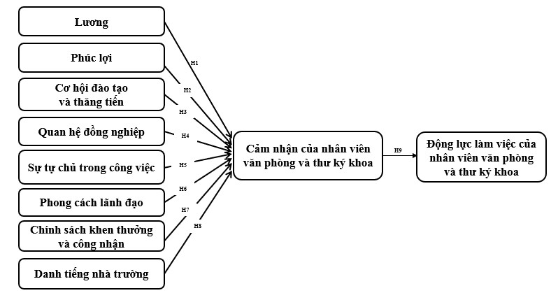Kế thừa các nghiên cứu trên và một số nghiên cứu khác, nhóm tác giả xây dựng mô hình các nhân tố ảnh hưởng đến Động lực làm việc của của nhân viên văn phòng và thư ký khoa tại UEF bao gồm: Lương; Phúc lợi; Cơ hội đào tạo thăng tiến; Quan hệ đồng nghiệp; Tự chủ trong công việc; Phong cách lãnh đạo; Chính sách khen thưởng công nhận; Danh tiếng Trường tác động đến Động lực làm việc của nhân viên văn phòng và thư ký khoa qua nhân tố trung gian là Cảm nhận của nhân viên văn phòng và thư ký khoa (Hình).