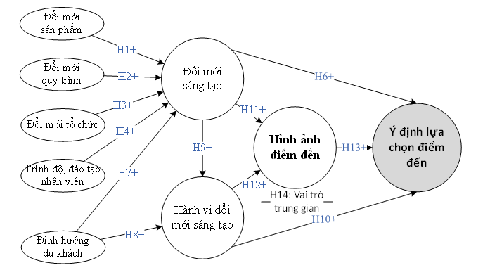 Cuối cùng, để làm rõ cơ chế tác động phức tạp, vai trò trung gian của Hình ảnh điểm đến được xem xét. Dựa trên các nghiên cứu của Qu và cộng sự (2011), Sharma và Nayak (2019) và Wang và cộng sự (2023) tác giả nhận thấy hình ảnh điểm đến là cầu nối quan trọng giữa các hoạt động đổi mới và quyết định của du khách; các giả thuyết về vai trò trung gian được đặt ra: