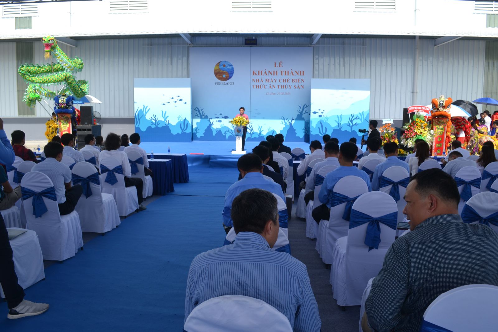 Phó chủ tịch tỉnh Cà Mau Lê Văn Sử phát biểu tại Lễ khánh thành Nhà máy chế biến thức ăn thủy sản tại KCN Khánh An, huyện U Minh