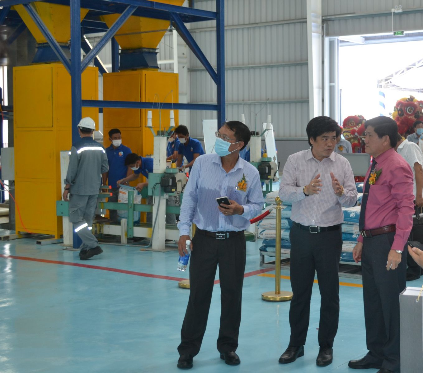 Lãnh đạo tỉnh Cà Mau và các quan khách tham quan Nhà máy chế biến thức ăn thủy sản ngày 20/8/2020