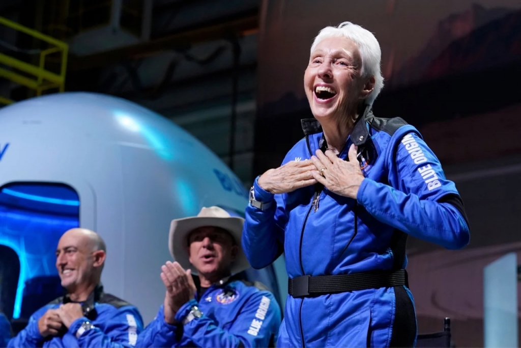 Khoảng trống cuối cùng. Ngày 20/7, phi công Wally Funk (phải) du hành vào vũ trụ trong một con nhộng do Blue Origin, một công ty hàng không vũ trụ của Mỹ sản xuất, cùng với tỷ phú Jeff Bezos (giữa), anh trai Mark (trái) và một sinh viên vật lý 18 tuổi. Ở đây, Funk mô tả chuyến đi "đáng kinh ngạc" trong một cuộc họp báo sau chuyến bay tại sân bay vũ trụ gần Van Horn, Texas. Ở tuổi 82, Funk là nhà du hành vũ trụ lớn tuổi nhất từ trước đến nay. Cô là một trong số 13 - 13 phụ nữ của sao Thủy đã xuất sắc trong các bài kiểm tra được thiết kế cho các phi hành gia nam trong chương trình bay vào vũ trụ đầu tiên của con người của NASA vào những năm 1960, nhưng chưa bao giờ tự mình lên vũ trụ.