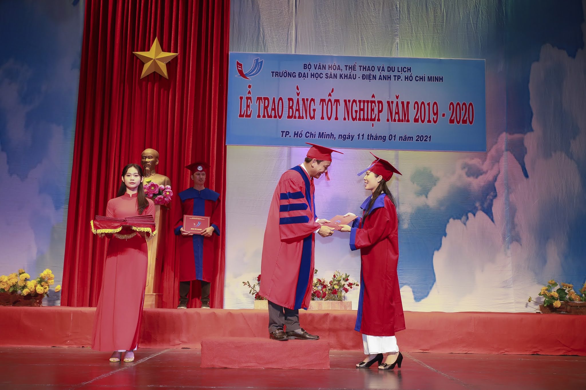 Hiệu trưởng trường Đại học sân khấu điện ảnh TP HCM, PGS -TS Đinh Quang Trung trao bằng tốt nghiệp