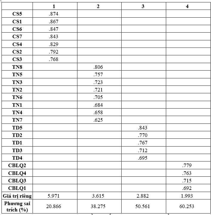 Kết quả phân tích EFA của biến độc lập và biến phụ thuộc được trình bày trong Bảng 1, 2, 3, 4.