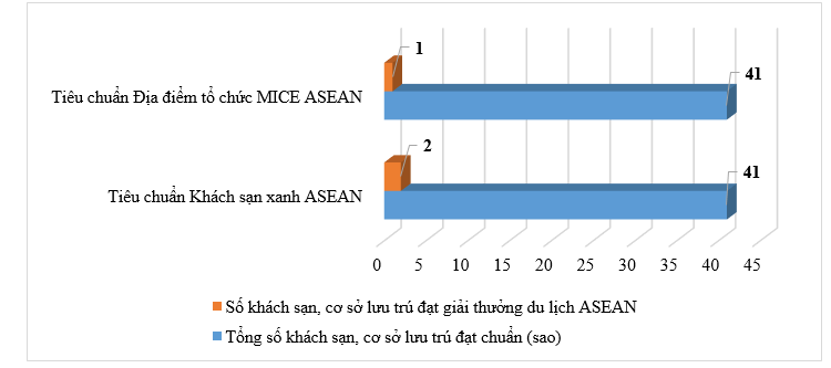 Hình 1 cho thấy, tính đến hết năm 2024, thống kê địa bàn TP. Huế có 9 cơ sở lưu trú đạt tiêu chuẩn 5 sao; 10 cơ sở lưu trú đạt tiêu chuẩn 4 sao; 05 cơ sở lưu trú đạt tiêu chuẩn 3 sao; 13 cơ sở lưu trú đạt tiêu chuẩn 2 sao và 04 cơ sở lưu trú đạt tiêu chuẩn 1 sao. Tuy nhiên, số lượng cơ sở lưu trú đạt tiêu chuẩn khách sạn xanh ASEAN và tiêu chuẩn địa điểm tổ chức MICE ASEAN để nhận giải thưởng du lịch ASEAN là rất khiêm tốn so với tổng số cơ sở lưu trú đạt chuẩn tại TP. Huế. Cụ thể: Có 1/41 cơ sở lưu trú được xếp hạng nhận giải thưởng Địa điểm tổ chức MICE ASEAN là Khách sạn Silk Path Grand Huế Hotel & Spa đạt tiêu chuẩn vào năm 2023 (Tổ chức sự kiện) và năm 2024 (phòng họp, hội nghị, hội thảo); Có 2/41 cơ sở lưu trú được xếp hạng nhận giải thưởng Khách sạn xanh ASEAN là Vedana Lagoon Resort & Spa đạt tiêu chuẩn năm 2021-2022; Khách sạn Pilgrimage Village đạt tiêu chuẩn năm 2018.