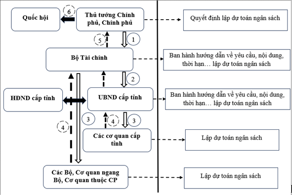 + Các cơ quan cấp tỉnh báo cáo lên UBND cấp tỉnh đó. UBND cấp tỉnh lập dự toán ngân sách địa phương báo cáo thường trực Hội đồng nhân dân (HĐND) cấp tỉnh xem xét, cho ý kiến, gửi Bộ Tài chính và các cơ quan có liên quan để tổng hợp, lập dự toán NSNN trình Chính phủ.