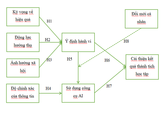 Nghiên cứu của Strzelecki (2023) về việc sử dụng chatbot AI hỗ trợ sinh viên đã chỉ ra rằng, các công cụ AI có vai trò quan trọng trong quá trình học tập của sinh viên. Những công cụ này không chỉ giúp cải thiện khả năng tương tác, mà còn đóng góp tích cực vào việc cải thiện chất lượng kết quả học tập của sinh viên. Việc tích hợp các công cụ AI vào giáo dục đã được chứng minh là giúp tối ưu hóa các phương pháp học tập. Do vậy, nhóm tác giả đề xuất giả thuyết như sau: