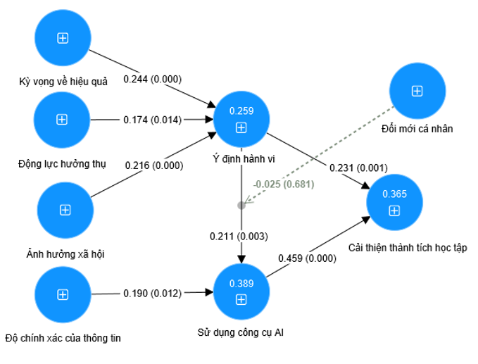 Đối với yếu tố độ chính xác của thông tin và ý định hành vi, nghiên cứu chứng minh rằng, Độ chính xác của thông tin càng cao, Ý định hành vi sử dụng AI càng lớn thường có quyết định Sử dụng công cụ AI trong học tập nhiều hơn. Kết quả này cũng phản ánh sự đồng thuận với nghiên cứu của Artur Strzelecki (2023). Tiếp đó, Ý định hành vi và Sử dụng công cụ AI được xác nhận có ảnh hưởng tích cực đến việc Cải thiện thành tích học tập của sinh viên. Kết quả này cũng đồng nhất với nghiên cứu trước đó của Artur Strzelecki (2023). Điều này thể hiện lợi ích của công cụ AI đem lại cho sinh viên khi sử dụng trong học tập đạt hiệu quả quả tốt hơn. Đây được đánh giá là các yếu tố tác động mạnh mẽ, vì khi sử dụng công cụ AI hỗ trợ trong học tập, sinh viên sẽ nhận được nhiều lợi ích, từ đó giúp sinh viên đạt được hiệu quả cao trong học tập dẫn đến chấp nhận và tin dùng AI.