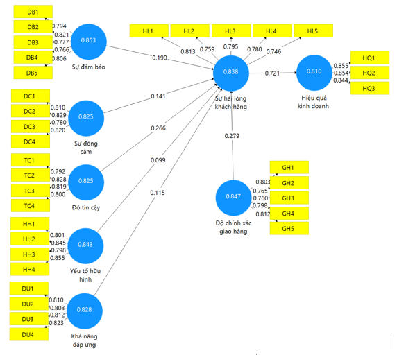 Kết quả Bảng 3 cho thấy, có 5 yếu tố tương quan thuận với Sự hài lòng của khách hàng ở mức độ ý nghĩa thống kê 5% và 1%. Trong đó, Độ chính xác trong giao hàng có tác động mạnh nhất đến Sự hài lòng khách hàng (β = 0,279, p < 0,01), thứ hai là Độ tin cậy (β = 0,266, p < 0,01), tiếp đến là Sự đảm bảo (β = 0,190, p < 0,01), Sự đồng cảm (β = 0,141, p < 0,05) và cuối cùng là Khả năng đáp ứng (β = 0,115, p < 0,05). Nghiên cứu chưa tìm thấy được sự ảnh hưởng của Tính hữu hình lên Sự hài lòng của khách hàng (bác bỏ giả thuyết H5). Đáng chú ý, nghiên cứu đã nhận ra sự tác động tích cực của Sự hài lòng khách hàng lên hiệu quả kinh doanh của doanh nghiệp với hệ số ước lượng β = 0,721, p < 0,01. Điều này góp phần khẳng định vai trò quan trọng của Sự hài lòng khách hàng là tiền đề mang lại hiệu quả kinh doanh của doanh nghiệp. Khi khách hàng cảm thấy hài lòng, họ có xu hướng gia tăng tần suất giao dịch, giới thiệu dịch vụ cho người khác và giảm tỷ lệ rời bỏ sản phẩm của doanh nghiệp. Tất cả những điều này đều góp phần trực tiếp vào tăng trưởng doanh thu và lợi nhuận của doanh nghiệp.