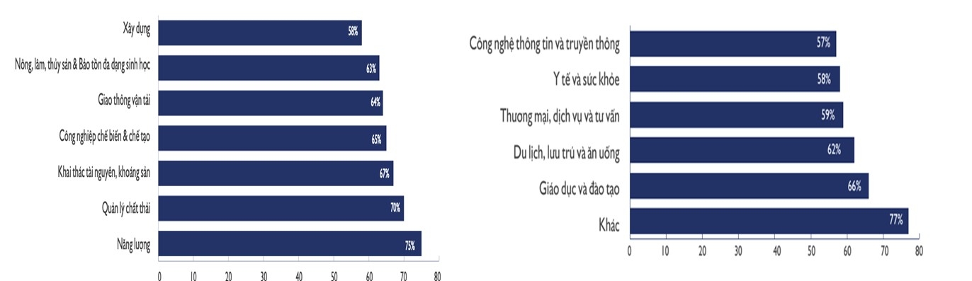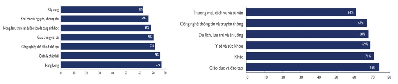 Ở trụ cột môi trường. Doanh nghiệp tham gia khảo sát được đánh giá qua năm câu hỏi thuộc năm chủ đề: chính sách, công bố thông tin, kiểm toán báo cáo, nhân sự và tập huấn. Các doanh nghiệp đạt điểm trung bình 52%, trong đó các doanh nghiệp lớn thực hành tốt nhất về mặt môi trường với điểm trung bình 66% và số điểm giảm dần theo quy mô từ doanh nghiệp vừa, nhỏ đến siêu nhỏ, đạt lần lượt 61%, 48% và 39%, mức độ quan tâm đến môi trường tỷ lệ thuận với quy mô doanh nghiệp. Với nhóm sản xuất, lĩnh vực Quản lý chất thải là lĩnh vực tiêu biểu với các doanh nghiệp thuộc lĩnh vực này đạt điểm trung bình là 71%. So với các lĩnh vực trong nhóm, Xây dựng vẫn còn nhiều hạn chế khi các doanh nghiệp xây dựng chỉ đạt 45% tổng số điểm. Với nhóm lĩnh vực phi sản xuất, doanh nghiệp thuộc nhóm ngành Công nghệ thông tin và truyền thông đang ở mức thấp nhất là 37% (Hình 1).
