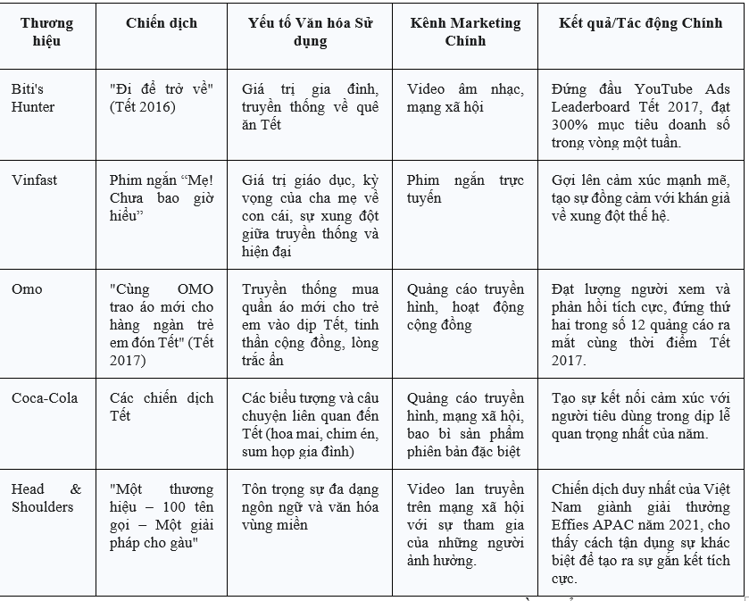 Thực tế, nhiều thương hiệu đã triển khai thành công các chiến dịch khai thác các giá trị và truyền thống văn hóa Việt Nam và tạo được dấu ấn trong tâm trí khách hàng. Ví dụ như: chiến dịch Tết của Biti's Hunter với thông điệp về sự trở về gia đình, như đề cao giá trị giáo dục và sự hiểu biết giữa các thế hệ trong các đoạn phim ngắn của mình, Omo với các sáng kiến từ thiện trong dịp Tết đã chạm đến lòng trắc ẩn và tinh thần cộng đồng của người Việt, Coca-Cola cũng thường xuyên có các chiến dịch Tết sử dụng các biểu tượng và câu chuyện mang đậm bản sắc văn hóa Việt Nam, chiến dịch của Head & Shoulders tôn vinh sự đa dạng ngôn ngữ bằng cách chấp nhận các cách phát âm khác nhau của tên thương hiệu trên khắp các vùng miền cũng là một ví dụ đáng chú ý (Bảng).